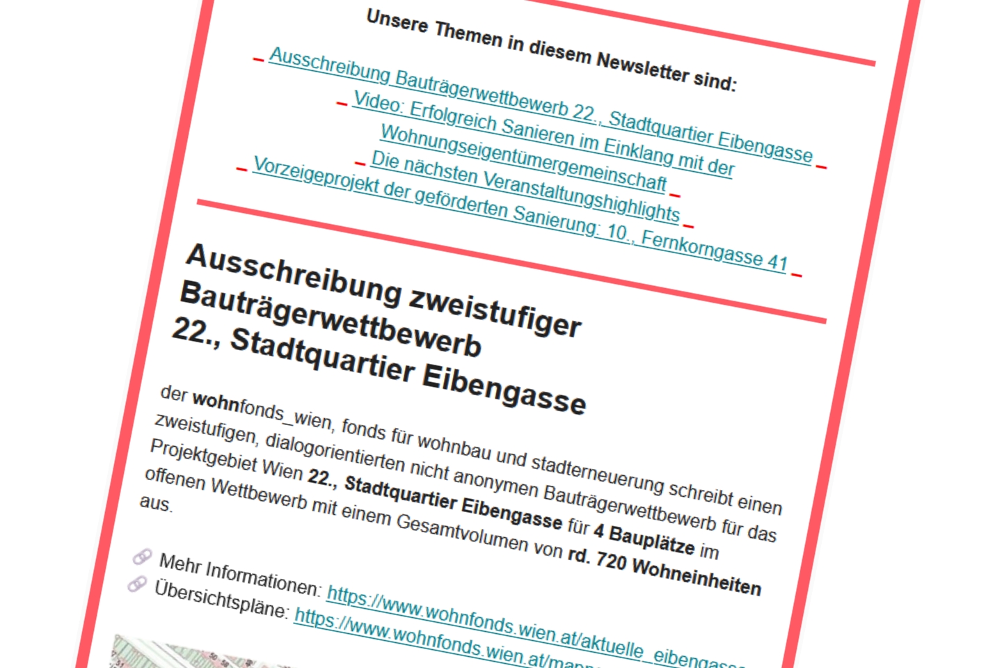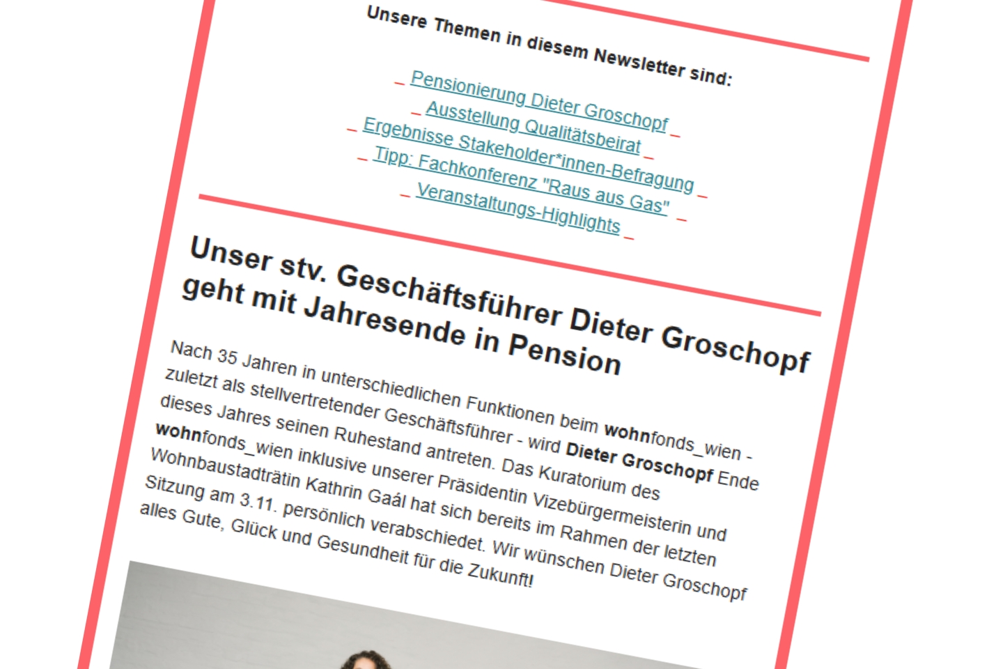 Mit unseren Newsletter-Services zu Themen des wohnfonds_wien und der Hauskunft versorgen wir Sie ein- bis zweimal pro Monat mit den wichtigsten Informationen zu gefördertem Wohnbau und Sanierung in Wien.